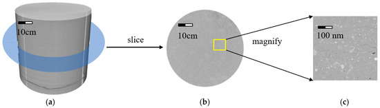 CT scan image for rock sample 1; (a) 3D CT scan image; (b) 2D CT slice image; (c) processed CT image.