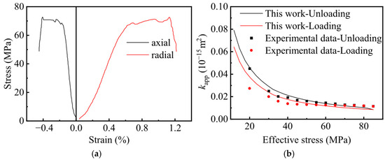 Rock sample 1; (a) stress-strain curve; (b) a comparison between this work and loading-unloading experimental data.