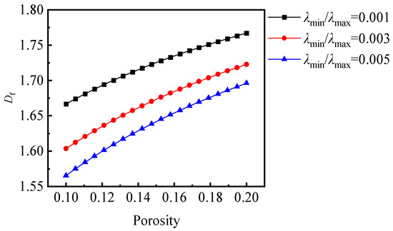 According to the formula Df = 2 − ln(ϕ)/ln(λmin/λmax), the pore radius fractal dimension is determined by porosity, Euclidean dimensionality, and the ratio of maximum pore radius to minimum pore radius. As shown in Figure 9, the pore radius fractal dimension increases with the porosity of the shale gas rock sample. When the porosity of the shale gas core sample is smaller, the pore radius fractal dimension becomes more pronounced. A smaller ratio of minimum pore radius to maximum pore radius results in a larger pore radius fractal dimension. This is because a larger pore radius fractal dimension indicates a greater number of pores. Moreover, with an increase in the porosity of shale gas, the pore radius fractal dimension also becomes larger. This is attributed to the fact that as the porosity of shale gas porous media increases, the number of pores in the shale gas porous media also increases.
