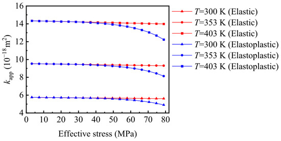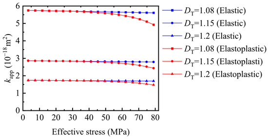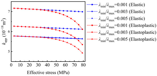 Figure 10 denotes the effect of effective stress on the shale gas’s apparent permeability at different ratios of minimum pore radius to maximum pore radius. As shown, a higher ratio of minimum pore radius to maximum pore radius corresponds to lower apparent gas permeability under the same effective stress. This phenomenon occurs because the reduction in pore radius is greater at higher effective stress levels. When stress exceeds the elastic limit, the permeability change from elastoplastic deformation surpasses that of elastic deformation under identical stress conditions. Consequently, shale gas’s apparent permeability decreases significantly with increasing pore radius fractal dimension. Whether shale is considered an elastic or a plastic medium also affects the evolution of permeability. The phenomenon is attributed to the fact that shale gas porous media with larger pore radius fractal dimensions have a larger pore space, resulting in smaller shale gas permeability at the same effective stress level. Additionally, plastic deformation induces larger pore radius strains than elastic deformation, amplifying permeability changes.