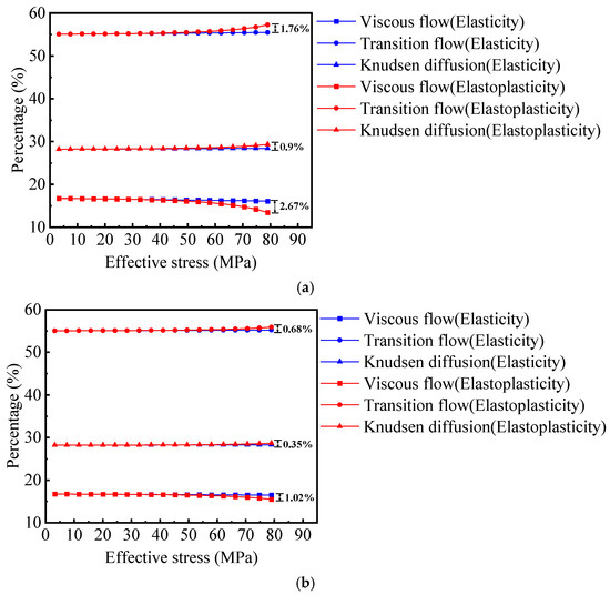 - As for Figure 11b with λmin/λmax = 0.00, the pore volume proportion of viscous flow decreases from 15.08% to 14.71%, transition flow increases from 52.58% to 52.82% when shale porous media is considered as an elastic body. For the elastoplastic body, the proportion of viscous flow decreases from 15.08% to 13.13%, while the proportion of transition flow increases from 52.58% to 53.8%. The pore volume proportion of Knudsen diffusion increases from 32.34% to 32.48% for the elastic body and from 32.34% to 33.08% for the elastoplastic body.