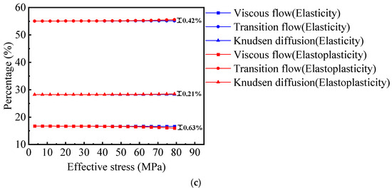 The relationship between the pore volume proportions of different flow mechanisms and effective stress when shale porous media is considered as an elastic body or an elastoplastic body: (a) λmin/λmax = 0.001; (b) λmin/λmax = 0.003; (c) λmin/λmax = 0.005.