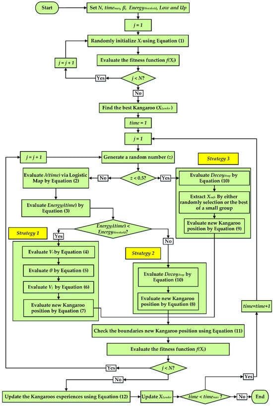 The KET enables each kangaroo to adaptively select its movement strategy—either zigzagging escape or long jumping—based on its current energy level (Energyj(time)), which evolves throughout the optimization process. A probabilistic threshold mechanism is employed, where energy is compared against a benchmark value (Energythreshold), set at 50%. If the kangaroo’s energy falls below this threshold, it favors the zigzag escape pattern to perform localized exploration. Conversely, when energy exceeds the threshold, it adopts long jump behavior to explore distant and potentially optimal regions. This dynamic strategy-switching mechanism allows KET to maintain an effective balance between exploration and exploitation across iterations.