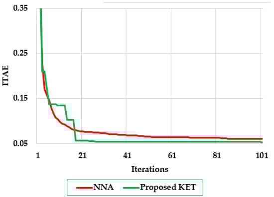 43] during the tuning process of a fractional-order PID controller, as measured by the ITAE. As shown, both algorithms begin with a relatively high ITAE value (~0.35), reflecting the poor initial solution quality. The KET (green curve) demonstrates faster convergence, reaching an ITAE below 0.06 within the first 20 iterations, with noticeable performance jumps in early stages. In contrast, the NNA algorithm (red curve) shows a more gradual and smoother convergence pattern, requiring more iterations to approach the same ITAE level. Both methods plateau after iteration 40, but the KET consistently maintains a lower ITAE throughout the simulation. The KET exhibits superior convergence efficiency, consistently lower ITAE throughout the simulation, indicating strong exploratory capabilities early in the search process and effective local exploitation later on. The sharper drop in ITAE values within the first 20 iterations indicates KET’s rapid discovery of promising regions in the search space.