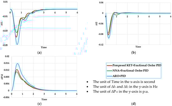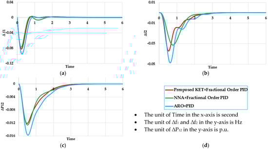 Figure 7 illustrates the stability responses due to SCL in Area 2, including both frequency and tie-line power deviations, under the control of (proposed KET+Fractional Order PID), ((NNA+Fractional Order PID), and (ARO+PIDn) controllers. The results clearly show that the KET-tuned fractional-order PID controller delivers superior performance in regulating frequency and tie-line power, even when power output conditions vary. Despite these fluctuations, the KET-based controller maintains robust transient behavior, demonstrating its ability to quickly and accurately respond to changes in load demand while preserving system stability.