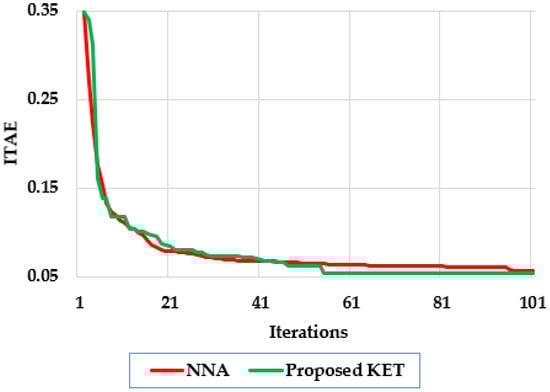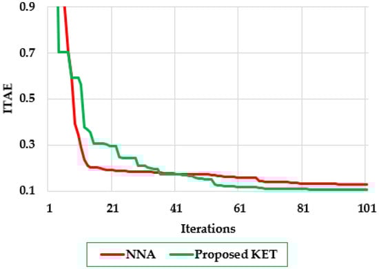43] during the tuning process of a fractional-order PID controller, as measured by the ITAE. As shown, the proposed KET exhibits better convergence efficiency after the 50th iteration, consistently lower ITAE throughout the simulation.