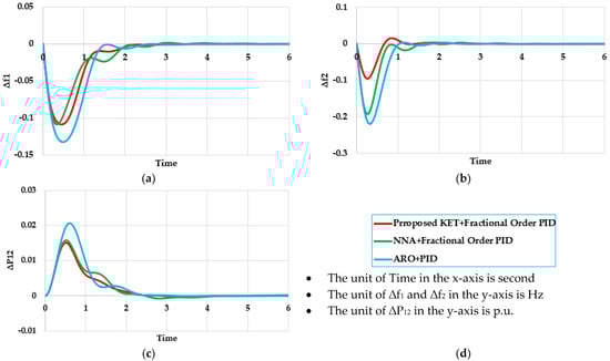 Table 2 provides a quantitative comparison of the Maximum Undershoot (MUT), Settling Time (SET), and Maximum Overshoot (MOT) for all three control approaches. Among them, the proposed (KET+Fractional Order PID) controller achieves the shortest settling times in both frequency and power transfer responses, measured at 2.8875 s, 2.6922 s, and 1.8921 s, clearly outperforming both (NNA+Fractional Order PID) and (ARO+PIDn) controllers in terms of dynamic response speed and stability.