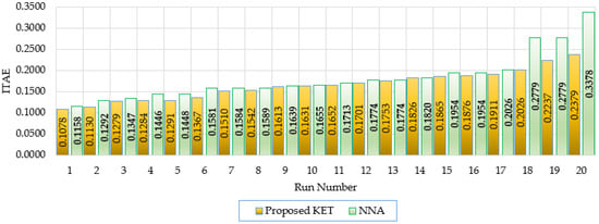 Figure 10 displays the results of 20 independent simulation runs, comparing the ITAE performance of the proposed KET against the NNA for tuning a fractional-order PID controller. As shown, the best ITAE achieved by KET is 0.1078, compared to 0.1158 from NNA, marking a 6.89% improvement. Also, the average ITAE across all runs is 0.1648 for KET versus 0.1775 for NNA, showing a consistent 7.2% improvement in overall performance. Moreover, the worst ITAE value for KET is 0.2379, significantly better than NNA’s 0.3378, reflecting a 29.58% improvement in worst-case behavior. Additionally, the standard deviation of ITAE in KET runs is 0.0351, which is lower than the 0.0550 of NNA, representing a 36.17% improvement in consistency. These results highlight the robustness and reliability of the proposed KET in optimizing the fractional-order PID controller. Not only does KET outperform NNA in the best-case scenario, but it also shows a tighter performance spread, indicating greater stability and repeatability across multiple runs.