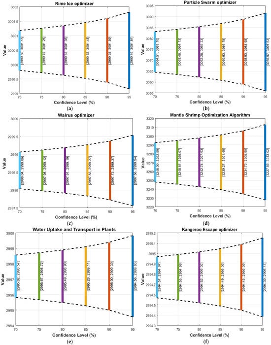 Figure 11a–f illustrates the distribution of fitness scores across various confidence intervals (95%, 90%, 85%, 80%, 75%, 70%) for each algorithm. The KET plot (f) shows a tight clustering of fitness scores, particularly at higher confidence levels (e.g., 95% and 90%), reflecting its robustness and reliability. In contrast, MShoa (d) exhibits a wider spread, indicating greater variability, while PSO (b) and WUTP (e) show moderate dispersion. RIME (a) and WO (c) perform reasonably but do not match KET’s consistency, especially at lower confidence intervals.