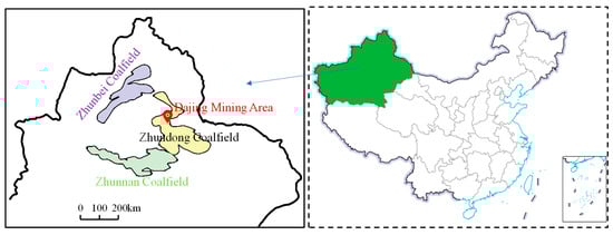 Zhundong Coalfield is located in the east of the Junggar Basin (as shown in Figure 1), accounting for 17.8% of Xinjiang’s coal reserves and 7% of the national coal reserves. The maximum thickness of a single-layer coal seam can reach 80 m, and the average thickness of a minable coal seam is 43 m. It is an important development area of Xinjiang’s energy industry. Within this coalfield, the Dajing mining area extends along the southern piedmont of the Cramaili Mountains, bounded westward by the Zhangpenggou anticlinal axis and eastward by the Jiangjunmiao anticline. This NNW-SSE trending basin spans 85 km longitudinally and 10–28 km latitudinally, encompassing 1340.86 km2. The general terrain of the mining area is a gently inclined slope with a high point in the north and a low point in the south, and most areas are relatively flat. The coal-bearing strata in the mining area are the Jurassic Xishanyao Formation, and the main recoverable coal seam is B1. The total thickness of the recoverable coal seam is 1.12~79.84 m, with an average of 41.40 m. The strike of strata in the main part is nearly east–west, and the dip angle is nearly horizontal.