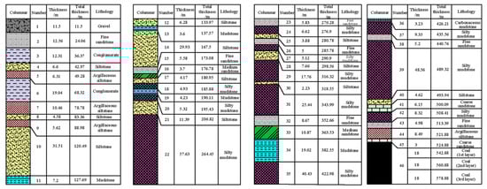 China’s western coalfields predominantly feature coal resources within Cretaceous and Jurassic strata, characterized by distinct diagenetic environments, geological ages, and sedimentary histories. Coal seams in these regions exhibit roof and floor strata composed of mudstone, shale, and alternating mudstone–sandstone sequences. These formations are collectively termed WCOLR []. The coal-bearing strata in the Zhundong mining field are Lower Jurassic Badaowan Formation (J1b), Middle Jurassic Xishanyao Formation (J2x), and Middle and Upper Jurassic Shishugou Formation (J2–3sh), among which the main coal-bearing strata are Middle Jurassic Xishanyao Formation (J2x). To characterize lithology and thickness distribution of OR at Zhundong No. 2 Mine, full-depth drilling (0–544 m) sampled roof strata above the 1101 LF (Figure 3). Drill logs were compiled following lithological consolidation principles (Figure 4), enabling comprehensive analysis of WCOLR failure mechanisms in Xinjiang mining conditions.