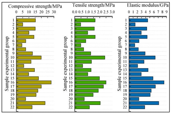 In the mine water prevention and control regulations, according to the engineering practice and the uniaxial compressive strength of rock, the OLR of coal seam roof is divided into four types: hard, medium–hard, weak, and extremely weak []. To illustrate the occurrence characteristics of OLR in 1101 LF, the physical and mechanical strength of rock samples with different burial depths was measured, and the specific results are shown in Figure 5. According to the physical and mechanical test data of rock samples, the general compressive strength, tensile strength, and elastic modulus of rock strata are less than 20 MPa, 2 MPa, and 5 GPa, respectively. Among them, weak and extremely weak strata account for more than 90%, and only two groups of samples show the characteristics of medium–hard strata. According to the borehole histogram, their thicknesses are only 5.2 m and 8.32 m, which are 84.6 m and 16.38 m away from the coal seam, respectively. In addition, there were many TSS with a thickness of 29.9~57.63 m, and the main lithology is siltstone and silty mudstone. To sum up, the mechanical parameters of the mine strata were lower than those of similar strata in the central and eastern mining areas. These strata macroscopically have loose, scattered, and weak characteristics such as low strength, poor cohesiveness, easy weathering, small faults, and undeveloped joint bedding [,], which were the typical WCOLR.