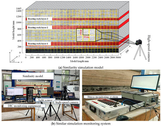 To reveal the development law of mining fractures and the spatial evolution characteristics of BS in the fully mechanized top-coal caving mining process of extra-thick coal seam, this paper takes the 1101 LF as the engineering background and uses a large-scale plane similarity simulation test system to carry out simulation research. According to the similarity theory [,,], the geometric similarity ratio is 1:400, the bulk weight similarity ratio is 5:8, the stress similarity ratio is 3:1000, and the time similarity ratio is 1:32. The size of the similar material experimental model is 3000 mm × 300 mm × 1440 mm, as shown in Figure 6a. Pure fine river sand with a diameter of less than 3 mm is selected as the aggregate, gypsum powder, and industrial light calcium carbonate as the cementing materials, and the mechanical properties of different rock strata were simulated by changing the content of the cementing materials. Spreading mica powder between strata reflects the layer effect between adjacent strata and prevents the OLR from collapsing as a whole during the advancing process of the LF. After the model is naturally dried, take out the mold, brush white latex paint on its surface, and draw spots evenly with black pigment. The bottom and left, and right sides of the model were rigidly fixed. According to the time similarity ratio, an excavation shall be conducted at intervals of 15 min. According to the actual advancing speed (5 m/d), the unit mining distance is 1.25 cm. In order to reduce the impact of boundary effects on model excavation, 375 mm coal pillars were left on both sides of the model. In the process of model advancement, a fixed-height camera is used to continuously photograph the position of the speckle pattern. The XTDIC (version 9.0.0) non-contact strain analysis software is used to visually monitor the strain and deformation characteristics of rock strata, as shown in Figure 6b. It should be noted that the hydro-mechanical properties of weakly cemented rock strata exhibit significant deterioration upon water exposure; hydrogeochemical processes are inevitably bound to drive alterations in fracture propagation within overlying rock sequences. However, due to the limitations of similar simulation devices, it is difficult to simulate water seepage in aquifers.