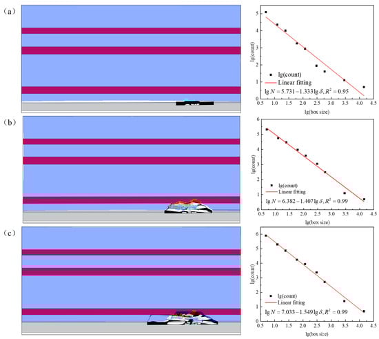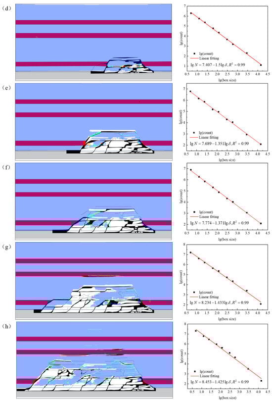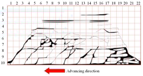 In this paper, the Adobe Photoshop 2020 software is used to sketch the photos of the OLR fracture network with different advancing distances, and ImageJ (version 1.51) software is imported for graying, binarization, and noise reduction. Black and white were used to represent fractures and rock strata, respectively. Finally, the fractal dimension (D) is calculated by Fractal Box Count in ImageJ to reflect the randomness and complexity of OLR fracture expansion under mining disturbance [,].