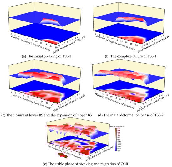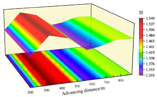 The spatial evolution law of the fractal dimension of the OLR fracture field is shown in Figure 10. During the LF advance, the spatiotemporal evolution of the OLR fracture field exhibits a characteristic sequence: fracture initiation; rapid development; near-field compaction, far-field propagation; and overall compaction. Under the influence of high-intensity mining disturbance, the extent of OLR damage progressively expands. Concurrently, horizontally BS fractures and vertically penetrating fractures interweave, forming a complex OLR fracture network. Compaction of fractures above the goaf, coupled with enhanced fracture development, propagation, and connectivity due to stress concentration at the LF boundaries, results in more pronounced fractal characteristics within these regions. Spatially, the OLR fracture network evolves driven by mining-induced damage propagation, extending upwards from the base and inwards from the periphery. Its expansion morphology transitions from an arch shape to a trapezoidal configuration, propagating deeper into the strata. The fractal dimension of the OLR fracture network fluctuates and evolves with the advance time, showing a self-fast and slow trend.