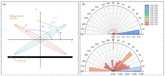 Rose diagram of global fracture angle distribution in OLR. (a) Schematic diagram of fissure angle. (b) Rose diagram of fissure angle distribution.
