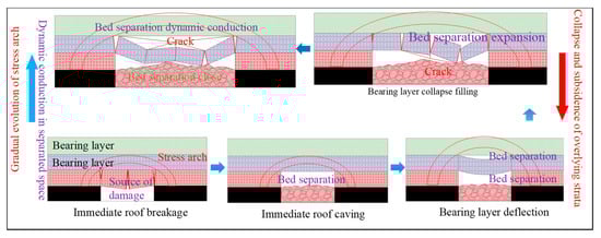 After the coal seam roof is disturbed by mining, when its hanging distance reaches the critical value, the rock layer breaks. The breakage rock layer cannot bear the load of the OLR, it deflects towards the unexcavated coal on both sides, forming a stress concentration zone, namely the stress arch structure []. Because the stress arch bears the load of OLR [,,,], the strata in the fractured arch were bent and deformed under the action of self-weight and compressive stress conducted by the fractured rock beam. Due to the difference in strata lithology and the small tensile and shear strength of the weak plane between layers, when the bending stiffness of adjacent lower strata is less than that of the upper strata, they will be grouped and settled, and the normal tension will occur on the weak plane between layers to form BS [,,,,,]. As the LF continues to advance, the upper strata gradually flex, and the BS gradually closes. When the upper strata reach the limit caving step, the strata break and compact the goaf, while the lower BS closes and a new higher BS is formed, and the stress arch upward develops synchronously. Due to the dissipation of mining damage, when the residual mining damage is not enough to cause the OLR to break, the OLR failure will stop. Due to the self-stabilizing ability of the stress arch, the high-level BS also stabilizes synchronously, thus forming a dynamic cycle of initial development, expansion, compression, closure, and high-level conduction of the BS, as shown in Figure 12.