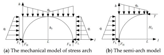 As shown in Figure 13, the arch is subject to a lateral load increasing uniformly with depth and a simplified vertical load. A lateral stress T acts at the top of the arch. The vertical reaction force at the arch foot is denoted FH, the horizontal reaction force is FL, the vault height is h0, and the height from the coal seam to the surface is H.