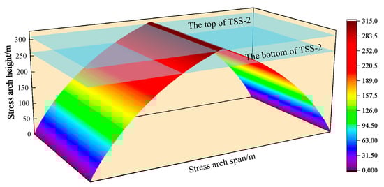 According to Equation (9), when the φ0 = 22°, M = 18 m, H = 525 m, the = 1.2, and the coal and rock mass friction coefficient f = 0.1, the calculated stress arch development height is h0 = 121.3 m for a critical span Dc = 240 m. According to the similar simulation results, the stress arch development height h0 =314.4 m after OLR migration stabilizes, as shown in Figure 14.