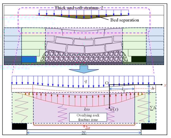 The protective layer undergoes bending deformation due to reactive support from the caved rock mass. In the middle of the goaf, due to compaction, it is in a straight state. Simultaneously, bending deformation occurs along the LF boundary and above coal pillars. However, fixed-beam structural models inadequately represent stope boundary deformation []. Therefore, this study predicts BS grouting capacity using Winkler elastic foundation beam theory []. The mechanical model is shown in Figure 15. In the figure, lw is the bending length of the rock beam; 2a is the BS span; 2L is the advancing distance; k is the elastic foundation coefficient of the goaf; is the total thickness of the foundation.