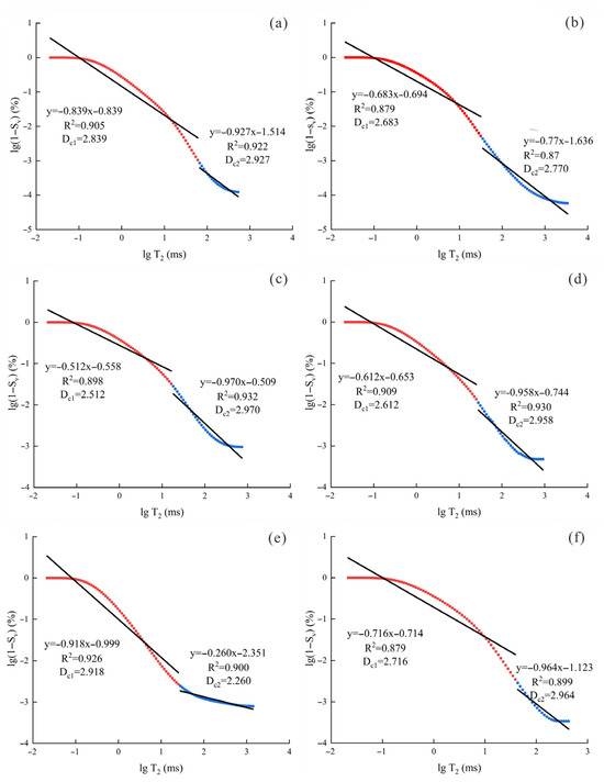 Fractal curve characteristics of each sample in the NMR box model: (a) S1; (b) S2; (c) S3; (d) S4; (e) S5; (f) S6.