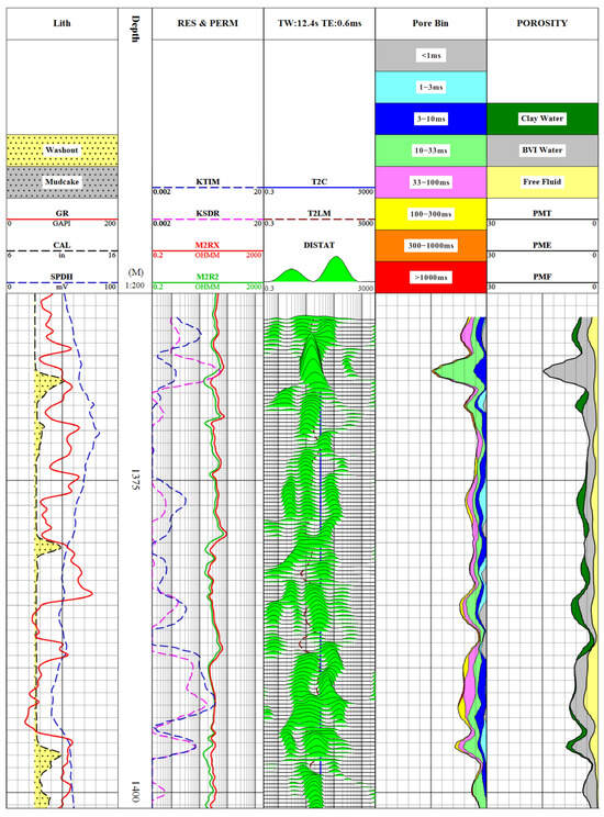 Interpretation of NMR logging data in the Linxing area (1362–1400 m).
