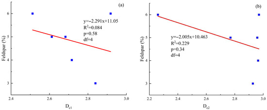 (a) Correlation between feldspar content and Dc1; (b) Correlation between feldspar content and Dc2 in the Linxing Area.