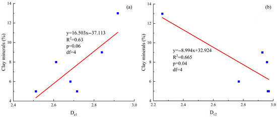 (a) Correlation between clay minerals and Dc1; (b) Correlation between clay minerals and Dc2 in the Linxing Area.