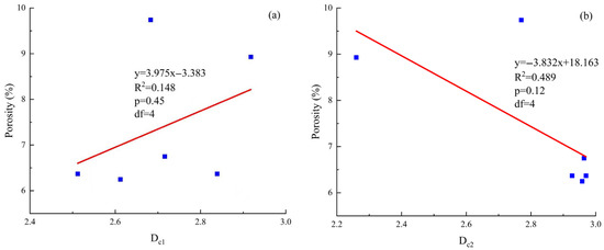 (a) Correlation between porosity and Dc1; (b) Correlation between porosity and Dc2 in the Linxing area.