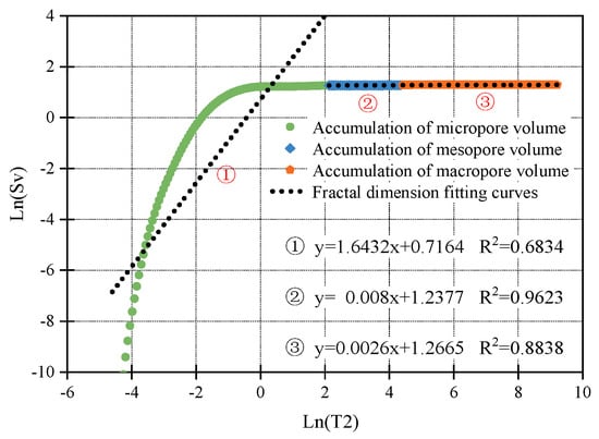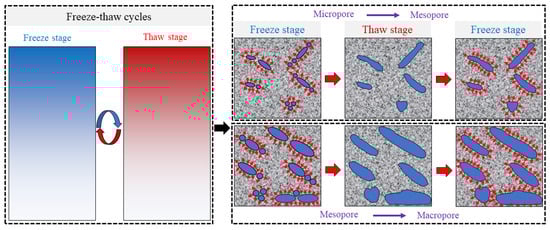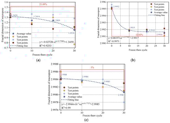 - Repeated F-T cycles induced water–ice phase transitions within pore water. When the volumetric expansion caused by the phase change exceeded the tensile resistance of the pore walls, micropores tended to expand into mesopores, and mesopores further evolved into macropores. Consequently, the micropore ratio decreased while mesopore and macropore ratios increased, resulting in an overall increase in total porosity. Micropores did not exhibit fractal characteristics, whereas mesopores and macropores showed clear fractal features. The transition from micropores to mesopores and from mesopores to macropores disrupted the self-similar power-law distribution of pore radii, leading to a decrease in fractal dimensions.