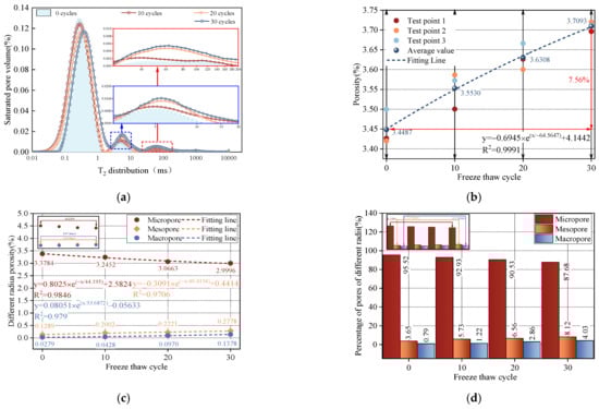 - With increasing F-T cycles, the total porosity, mesopore porosity, and macropore porosity of sandstone all showed an increasing trend, while the micropore ratio decreased. All porosity parameters exhibited clear exponential relationships with the number of cycles. Additionally, the fractal dimensions of micropores, mesopores, and macropores decreased exponentially with F-T cycles.