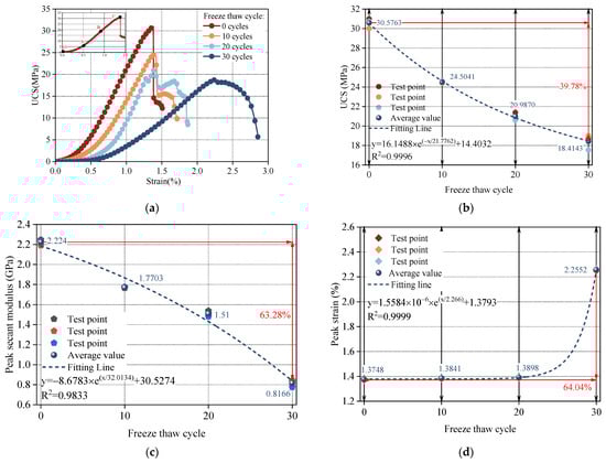- The compaction stage in the stress–strain curve became more pronounced as the number of F-T cycles increased. Meanwhile, both the peak strength and peak secant modulus decreased, whereas peak strain increased. All these parameters exhibited significant exponential relationships with the number of cycles.
