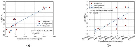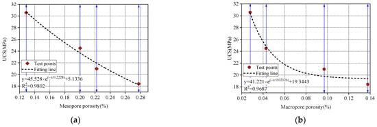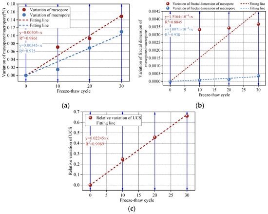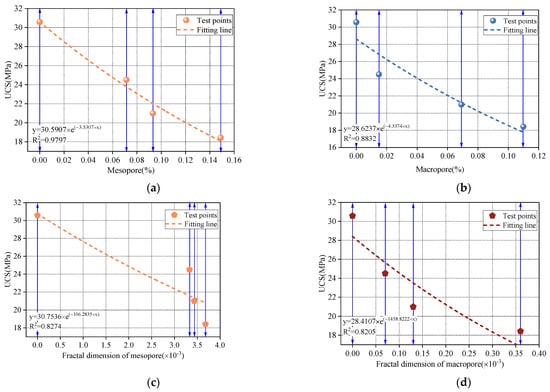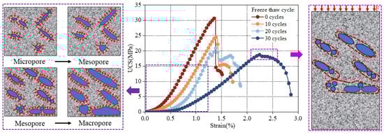 - The mesopore and macropore porosity both exhibited strong exponential correlations with UCS, with the mesopore ratio showing a stronger correlation. Similarly, the fractal dimensions of mesopores and macropores also showed exponential relationships with strength, with the mesopore fractal dimension demonstrating a stronger association. As the mesopore and macropore ratios increased, the compaction stage in the stress–strain curve became more evident, and peak strain increased. During loading failure, the interconnected mesopores caused by freeze–thaw damage reduced the deformation resistance and bearing capacity, resulting in a decrease in both the peak secant modulus and peak strength.