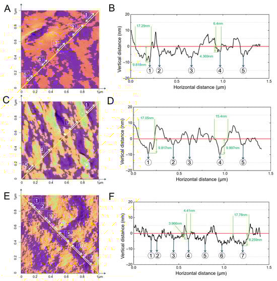 Although 3D micromorphological images based on AFM can characterize apparent properties to some extent, the 3D surface data obtained by AFM cannot directly correlate internal structure with macroscopic properties. However, cross-sectional analysis allows for the establishment of multiscale correlations. Therefore, we selected three samples with different volatile matters and high degrees of metamorphism and performed cross-sectional operations. Cross-sectional analysis can be used to directly measure the depth of surface features by selecting the surface contour curve of the cross-section in the 3D image, as shown in Figure 3B,D,F. Figure 3A,C,E exhibit the pore distribution (indicated by purple areas) in cross-sections B, D, and F of the samples, respectively. Cross-section B exhibits pores with diameters ranging from 6.4 nm to 17.29 nm, corresponding to depths of 4.369 nm to 9.818 nm, and features three prominent large pores. Cross-section D has a maximum pore diameter (17.05 nm) and depth (9.817 nm) similar to those of cross-section B, but with an increased number of micropores. Cross-section F shows a decrease in height differences and a further increase in the number of micropores. The variations in pore structure across these cross-sections indicate a systematic evolution in the surface pore distribution as the degree of coal metamorphism increases.
