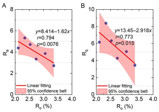 Correlation between surface roughness and vitrinite reflectance. (A) Average roughness Ra; (B) root mean square roughness Rq.
