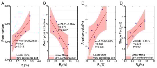 Linear regression analysis indicates that there is a significant statistical correlation between coal nanopore structural parameters and vitrinite reflectance (Ro). As coalification increases, the number of pores exhibits a significant positive correlation (r = 0.908, Figure 5A). Correspondingly, the average pore diameter parameter shows a negative correlation trend (r = 0.876, Figure 5B). Specifically, an increase in Ro leads to a linear increase in pore density per unit volume, accompanied by a systematic decrease in average pore size. These changes suggest that as the degree of metamorphism increases, primary large pores are compressed, closed, or even destroyed. Meanwhile, aromatization and condensation reactions occur in the organic matter molecular structure, generating new micropores. Additionally, the study found a significant positive correlation between areal porosity and Ro (r = 0.836, Figure 5C). This is primarily due to the condensation and orderly arrangement of aromatic lamellae, along with the precipitation of small molecular compounds, which create a large number of new, smaller-diameter micropores within the coal matrix, thereby increasing the surface area porosity. Figure 5D shows a positive correlation between the shape factor and Ro, suggesting that during coalification, the shapes of nanopores in coal tend to become more regular. This is because the large and medium pores with the most complex morphologies decrease during coalification, leaving mostly enclosed micropores whose morphologies are controlled by the highly ordered carbon layer structure, making them closer to polygonal or quasi-circular shapes. Consequently, the shape factor increases, and the morphologies become relatively regular.