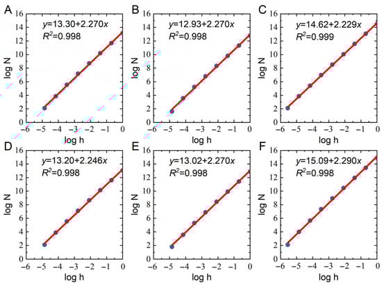 where N represents the total number of grid units required to cover the surface (dimensionless parameter); Df denotes the fractal dimension, which characterizes the intensity of self-similarity of the surface; I is the characteristic size of the smallest cubic unit (unit: nm); and B corresponds to a dimensionless coefficient in the scaling relationship.