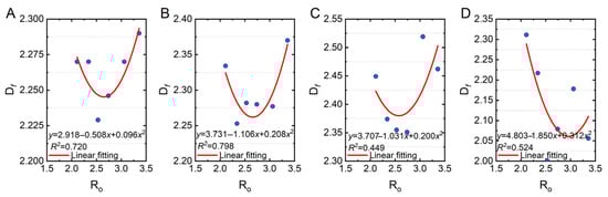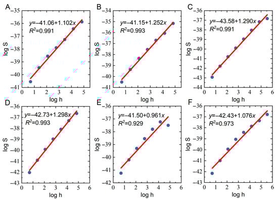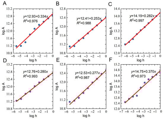 Fractal dimension analysis was conducted on six coal samples using the triangulation method (Figure 7). A linear regression model was established based on the principle of least squares, and the fractal dimension values of each coal sample were obtained according to Equation (8) by calculating the slope of the best-fit straight line through the data points. The correlation coefficient R2 for all fitted models exceeded 0.97, indicating a statistically significant linear correlation. This quantitative result demonstrates that the pore structure of coal exhibits significant fractal characteristics, confirming the applicability of fractal theory in the characterization of the microstructure of coal samples. As can be seen from Figure 7, log A for all the coal surfaces exhibited a positive power-law variation. Meanwhile, as the Ro increased, the fractal dimension of the coal samples first decreased from 2.334 to 2.253 and then increased from 2.253 to 2.370.