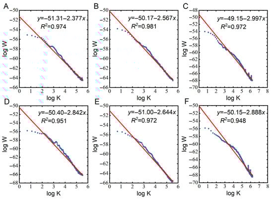 The study conducted power spectrum analysis on six coal samples (Figure 9), obtaining slope values (β) by fitting data points through least squares linear regression. The fractal dimension of each coal sample was then calculated using the formula Df = 7/2 + β/2, based on the fractal dimension calculation. The linear correlation coefficients for all fitting results exceeded 0.94, indicating a high degree of fit for the linear model and validating the applicability of fractal theory in the analysis of coal samples in this study. As seen in Figure 9, the log W of all coal surfaces exhibited negative power-law variations. Meanwhile, according to Table 3, with increasing Ro, the fractal dimension of the coal samples first decreased from 2.311 to 2.001 and then increased to 2.178.