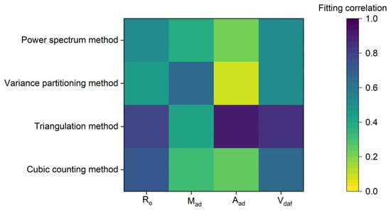 To investigate the trends in the influence of Ro and proximate analysis parameters on the fractal dimension of coal samples, this study employed various methods such as the cube-counting method, triangulation method, variance partition method, and power spectrum method to obtain fractal dimension analysis results. The fitting analysis based on fractal dimension and the aforementioned parameters (Figure 10) reveals that the fractal dimension obtained through the triangulation method exhibits the best correlation with coal metamorphism degree, ash content, and volatile matter. In contrast, the fractal dimension derived from the variance partitioning method shows the highest correlation with moisture parameters. The specific influences of these factors on the fractal dimension of coal samples are detailed below.