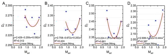 Moisture primarily exists in the pores and fractures of coal. By filling micropores and covering rough surfaces, it alters the pore structure and surface morphology, thereby affecting the irregularity and complexity of the coal surface. Figure 12 illustrates the correlation between the fractal dimensions of the selected samples and their Mad using different analytical methods. As the Mad increases, the fractal dimensions of the coal samples exhibit a trend of first decreasing and then increasing. This trend suggests that in the initial stage, the originally dry and exposed coal surface is abundant with rough nanoscale details (high peaks and deep valleys), with AFM images showing significant height fluctuations and a higher fractal dimension (Df), indicating a more complex and irregular surface. As the Mad increases, it gradually fills in the surface depressions, grooves, and entrances of small-scale pores at the atomic scale, rendering the apparent morphology detected by AFM relatively smoother and more continuous, thus diminishing the surface irregularities. In the subsequent stage, the fractal dimension trends upwards, indicating that a large amount of moisture fills the open nanopores on the surface and forms nanoscale liquid bridges between adjacent surface protrusions, particles, or pores, increasing the surface complexity with more irregular connections and fluctuations appearing at the micrometer scale.