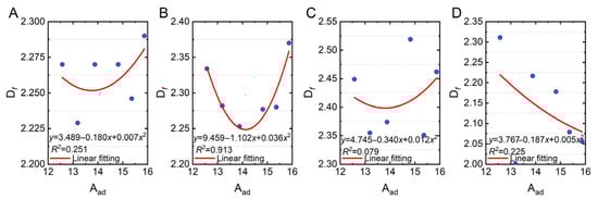 Statistical correlation between fractal dimension and Aad of coal samples based on different fractal characterization techniques: (A) cube-counting method; (B) triangulation method; (C) variance partition method; (D) power spectrum method.