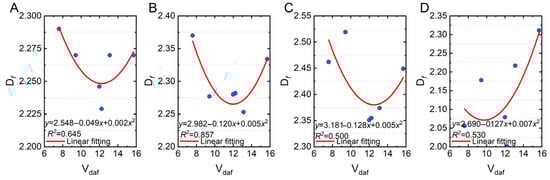 Volatile matter refers collectively to the gaseous and liquid products released through the pyrolysis of the organic matter in coal under specific conditions. It essentially serves as an indicator for measuring the content of thermally unstable components in the organic matter of coal. During the release of Vdaf, the structure of coal undergoes significant changes: closed pores open up, existing pore channels expand, and new pores form, even creating complex pore networks. These changes alter the pore structure of the coal samples, which in turn affects the fractal dimension. Figure 14 illustrates the response relationship between the fractal dimensions of coal samples and their volatile matter contents: as the volatile matter content increases, the fractal dimension exhibits a nonlinear evolution, first decreasing and then increasing. This evolution pattern reflects a continuous enhancement in the condensation degree of aromatic carbon rings within the macromolecular structure of coal as the volatile matter decreases. The orderly arrangement and increased size of aromatic lamellae make the spacing between lamellae more uniform. Many of the originally existing tiny pores are compressed and closed under strong lateral pressure and thermal forces. Consequently, the overall structure of coal becomes denser, and its surface tends to be simpler, more regular, and smoother, leading to a reduction in fractal dimension. When Vdaf decreases to a certain range, the condensation and graphitization trend of aromatic lamellae reach a critical point. The carbon atom network tends towards a more stable graphite structure, resulting in intense volumetric contraction. Enormous internal stresses arise within and between the highly ordered and rigid aromatic lamellar structures. When the stress exceeds the local strength, numerous nanoscale or even micrometer-scale microfractures form, greatly increasing surface irregularity.