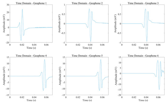 Due to limitations in accurately recording the start time during hammering, the absolute propagation time cannot be directly measured. Instead, the propagation time from the source to each geophone is estimated by subtracting the first-arrival time at the reference geophone from those recorded by the receiving geophones. The filtered signal, with first-arrival times extracted using the fractal box-counting dimension, is compared with results obtained via manual picking, CWT, and STFT, as shown in Table 5.