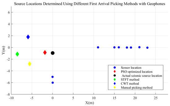 In this study, after denoising the microseismic event signals using the OVMD-WTD method, an improved fractal box-counting dimension algorithm was applied to accurately identify the first-arrival times. These times were then used in source localization inversion via the PSO algorithm. The localization results are shown in Figure 17. The true source location was (0.032, −0.943) m, and the inverted result was (−1.85, −0.85) m, yielding an error of approximately 1.882 m in the x-direction and 0.093 m in the y-direction. The total localization error was within 2 m. Compared with traditional approaches such as CWT and STFT, the proposed method demonstrates higher accuracy in first-arrival picking and improved spatial localization reliability, significantly enhancing overall localization performance. It is important to note that, in the physical experiment conducted in this study, source localization relied solely on first-arrival information extracted using the fractal dimension method, without incorporating amplitude or energy attenuation parameters. Given the directionality of the hammer source and the inherent heterogeneity of the experimental medium, amplitude values are subject to significant fluctuations, which can compromise the stability of amplitude-based localization. Therefore, this study focuses on a time-domain-based localization framework, which includes signal denoising, first-arrival identification, and PSO-based inversion, effectively avoiding cumulative errors caused by amplitude instability.