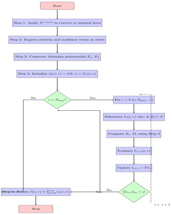 The convergence of the MADM in this work is underpinned by the contractive nature of the integral operator (T) appearing in the integral formulation (Lemma 2) and the fixed-point framework developed in Section 3. Under assumptions (G1)–(G3) and the smallness condition of (Theorem 6), the operator (T) is contractive on the chosen Banach ball and admits a unique fixed point; consequently, the MADM partial sums () converge to the unique solution (), and one can obtain geometric-type error estimates in terms of the contraction constant of (for instance, a bound () holds in the contractive regime). Therefore, in practice, we recommend the following convergence checks when applying MADM: monitor the incremental norm () and the residual () and stop when both fall below a prescribed tolerance.