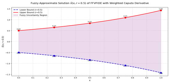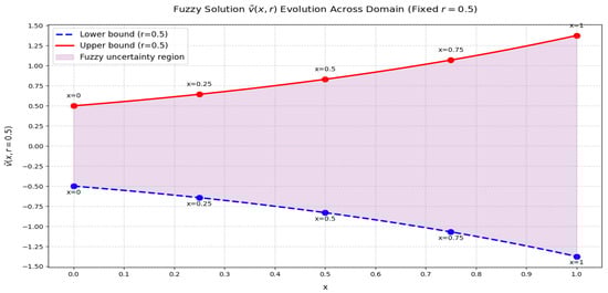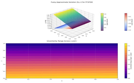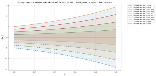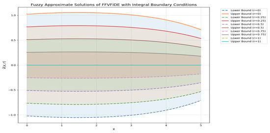 Figure 5 demonstrates the influence of varying the r level on the fuzzy solutions. A lower r level corresponds to greater fuzziness, while increasing the r level reduces the degree of fuzziness. In Figure 6, the impact of different values of x on the fuzzy solutions is depicted. Smaller x values are associated with reduced fuzziness, whereas larger x values tend to enhance it. Figure 7 presents the combined effects of varying both x and r levels on the fuzzy solutions, offering a more comprehensive perspective based on the observations in Figure 5 and Figure 6.