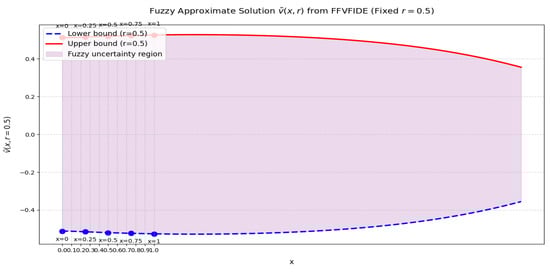 Therefore, the conditions of Theorem 2 are satisfied, ensuring the existence and uniqueness of a solution () on . Furthermore, since , the problem is fuzzy Ulam–Hyers stable (UHS), generalized fuzzy UHS, and fuzzy UHRS, provided a continuous and positive function exists.
