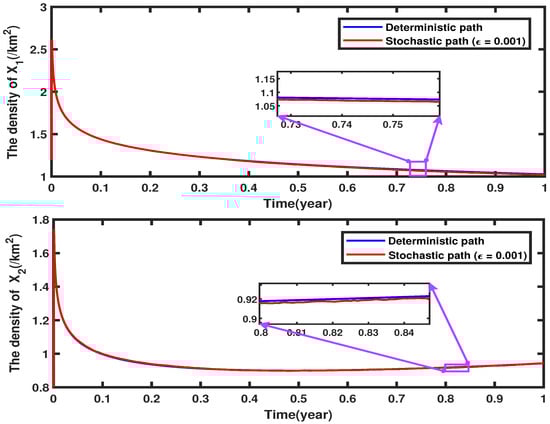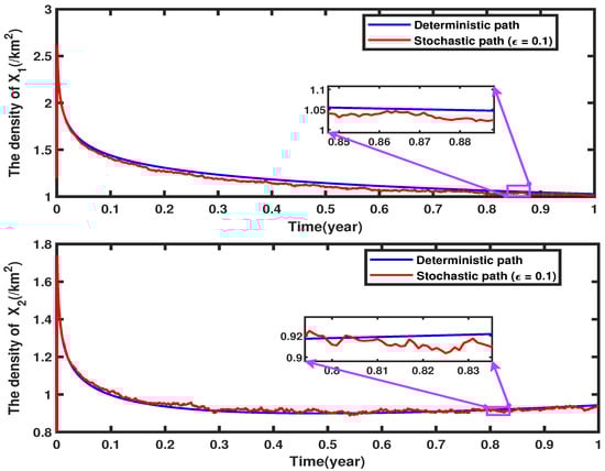 To analyze the changes of egret and goshawk population densities under different noise disturbances, we first draw the deterministic and stochastic paths of the two species under noise with the above parameter settings, and the results are shown in Figure 1. It shows the deterministic path (blue solid line) and stochastic path (red curve) of Egret and Goshawk with time under noise , respectively. It can be seen that the noise intensity at this time has a great influence on the population density of the two birds. At the initial stage, the stochastic path fluctuates around the deterministic path, but with the passage of time it deviates from the deterministic path and shows strong randomness.