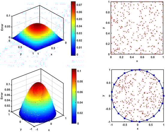 is a pseudo-random number added into the accurate boundary conditions, and represents the level of noise. First, we illustrate the efficiency of our meshless approach for solving inverse problems on the square domain. Then in Example 3, we deal with the nonlinear irregular exterior problem on the star domain generated by criteria , (). The accuracy is measured by